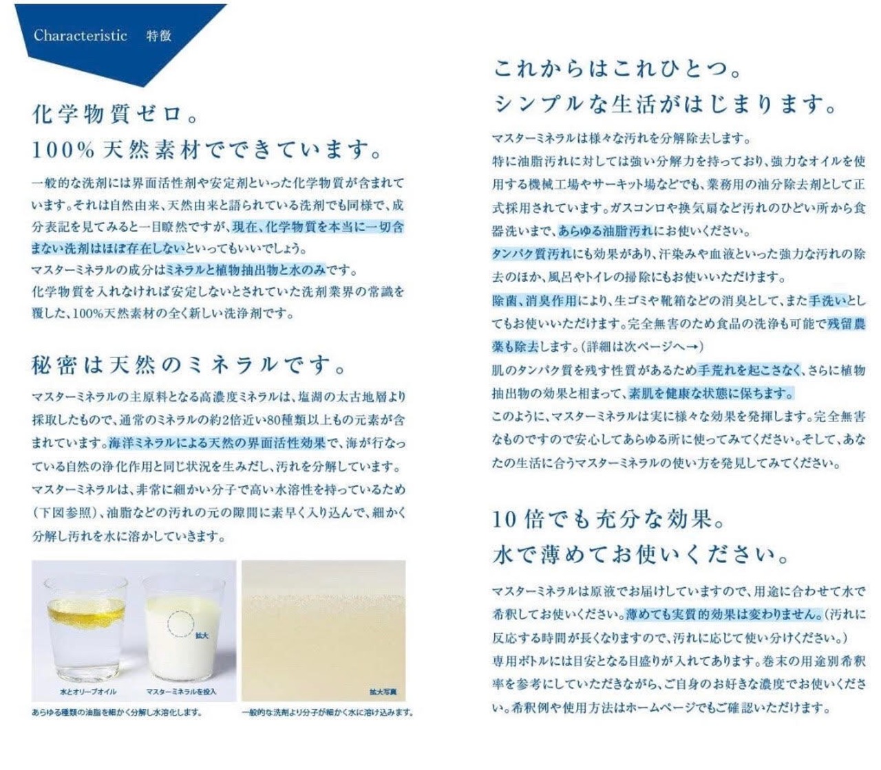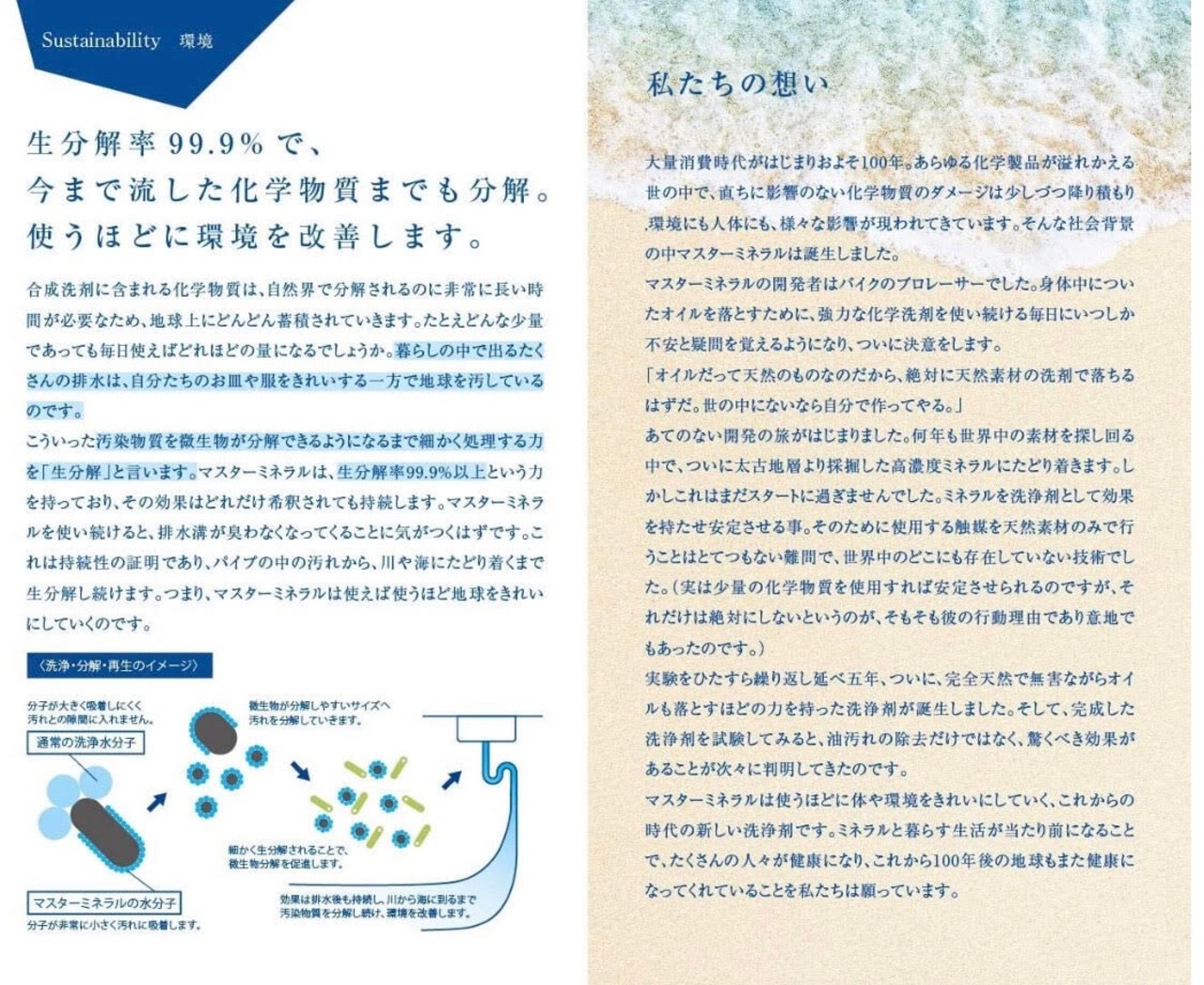 ・化学的成分はもちろん由来成分も一切無配合。天然のミネラルが持つ界面活性効果を天然成分のみで安定に成功。生分解率99.9%以上の力であらゆる汚れを分解します。